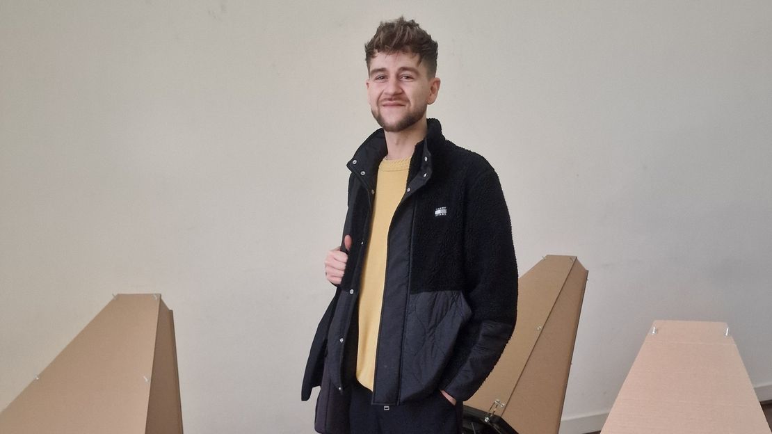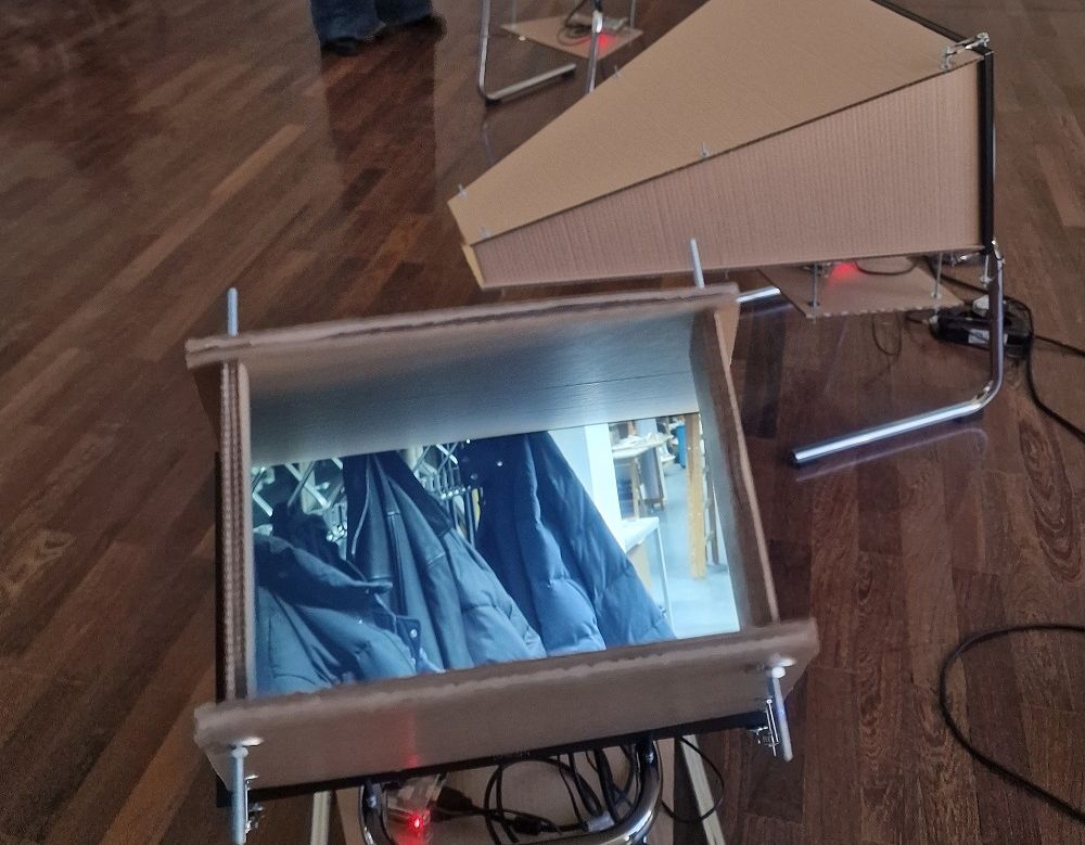 „Da der Raum, in dem wir uns gerade befinden, denkmalgeschützt ist, stellt sich uns Studierenden jedes Jahr die Frage: Wie gehen wir damit um? Was und wie präsentieren wir der Öffentlichkeit? Wir haben uns entschieden, keine Modelle oder Skizzen zu zeigen, sondern uns als eine Gemeinschaft präsentieren“, erläuterte Suna Ozankan, Tutorin der Klasse Baukunst, das diesjährige Gemeinschaftswerk der Klasse Baukunst der Gruppe junger Planerinnen und Planer. Im großen, neutral gehaltenen Raum in der ersten Etage der Kunstakademie Düsseldorf sind mehrere identische trapezförmige Objekte aus Karton zu sehen, die gleichmäßig im Raum verteilt sind. Sie erinnern formal an schräge Pulte oder abstrahierte Monitore: oben jeweils eine geneigte, braune Fläche, darunter schwarze technische Elemente. Kabel liegen sichtbar auf dem Boden und verbinden die einzelnen Stationen mit Stromquellen, was den installativen, provisorischen Charakter der Arbeit unterstreicht.