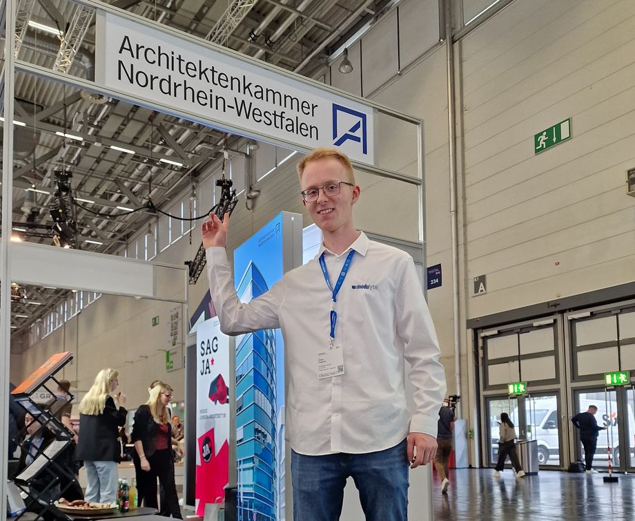 Werkstudent Christian dos Reis erfuhr von der Führung von einer Kollegin aus dem Architekturbüro, in dem er neben seinem Studium tätig ist. Für seinen Arbeitgeber, ein international agierendes Planungs- und Architekturbüro, spiele die Digitalisierung eine wesentliche Rolle. „Die Junge Planer-Führung war für mich eine großartige Gelegenheit, mit der Architektenkammer NRW in Kontakt zu treten und gleichzeitig einige ausgewählte Stände auf der Messe zu besuchen“.