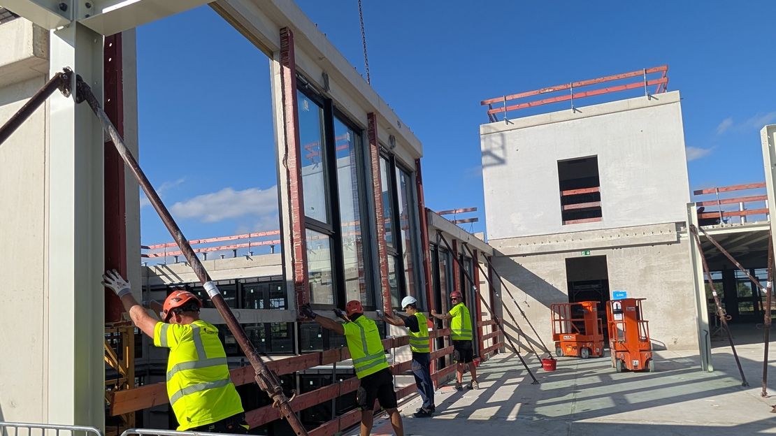 „Das Unsichtbare am Gebäude gestalten wir seriell, und das Sichtbare individualisieren wir.“ Mit diesen Worten stellte Holger Unkhoff, Geschäftsführer der Goldbeck West GmbH, am 18. September einer kleinen Gruppe junger Planerinnen und Planer den Rohbau des neuen Goldbeck-Bürogebäudes in Monheim am Rhein vor.